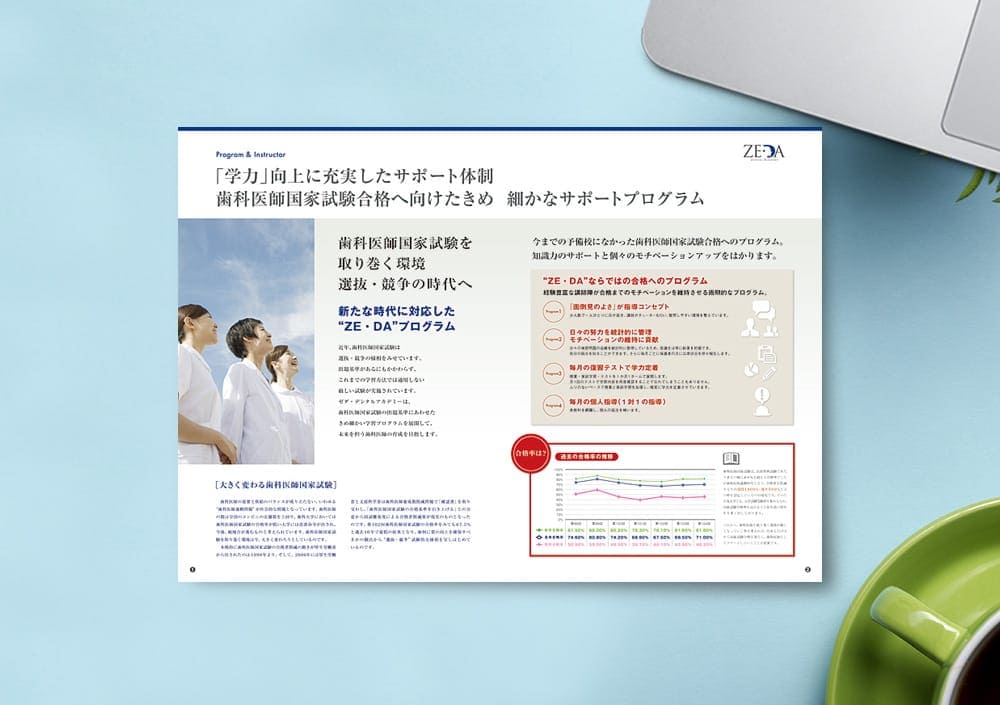 歯科医師を目指す人を対象とした予備校のA3二折パンフレットです。ロゴカラーに合わせた色合いです。