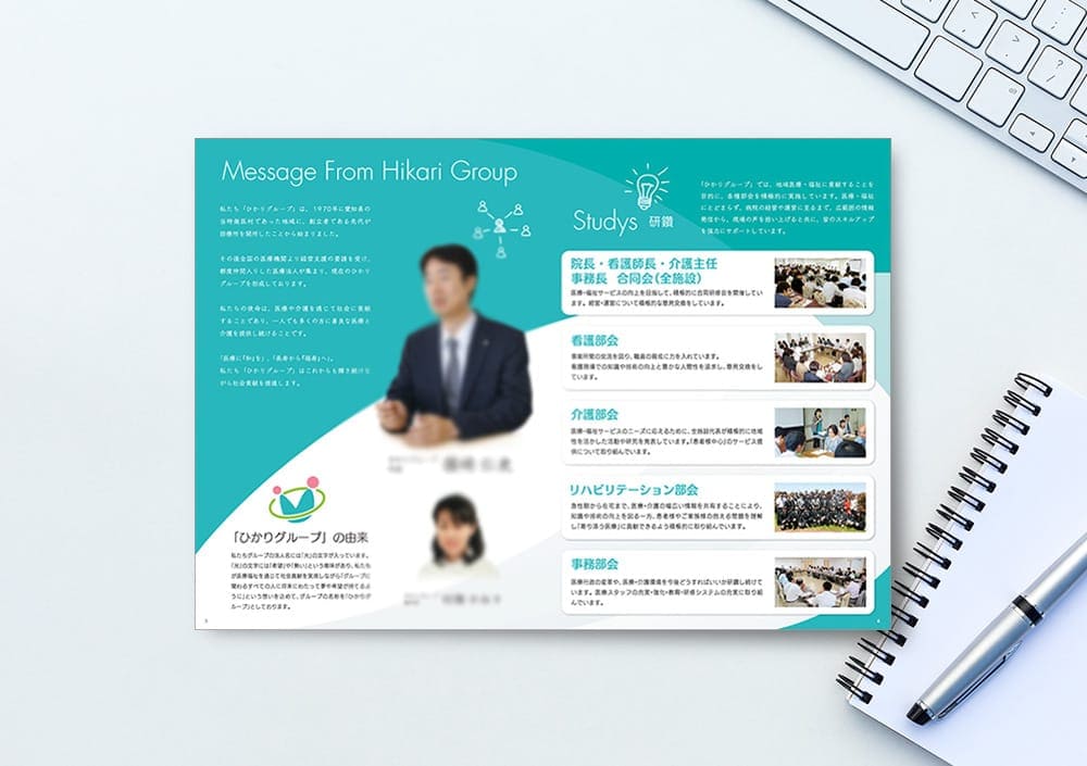 医療介護グループ「ひかり」の総合案内カタログです。各エリアと施設を色別で分かりやすくカテゴリー分けし構成しています。情報の多いパンフレットの場合は、ルールを決めて、そのルールに従ってページを作っていくのがコツです。