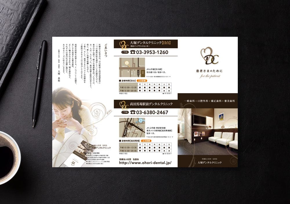 歯科医院様の三つ折リーフレットです。主に、女性をターゲットとしたデザインになっています。