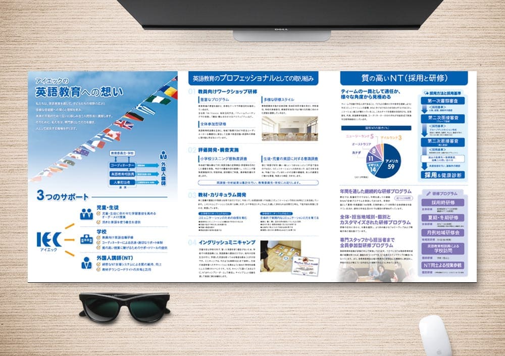 株式会社アイエック 様東京都仕様A4仕上がり三つ折りパンフレット用途サービス案内/設置用・配布用No.2363 デザインのポイント 語学系のスクールパンフレットです。 子どものイメージにより親御さん世代へ訴えかけています。 シンプルに、スクール様の真面目さを表現するデザインしました。WORK デザイン 構成企画 イメージイラスト提供 地図作成 イメージ写真提供PRICE 参考価格 120,000円 〜 300,000円 見積依頼 お問い合わせ PRE NEX